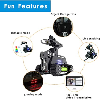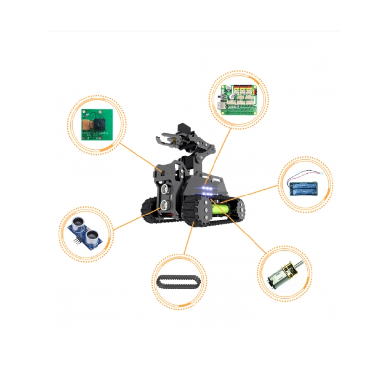 2. Reconocimiento de objetos, seguimiento, detección de movimiento-basado en openCV; Seguimiento de líneas-basado en reflexión infrarroja; Arquitectura C/S-se puede controlar de forma remota mediante la aplicación GUI en PC; WS2812 RGB LED-puede cambiar una variedad de colores, lleno de tecnología; Transmisión de vídeo en tiempo real; Equipado con un brazo robótico 4-DOF.